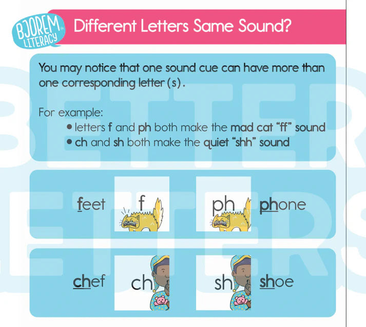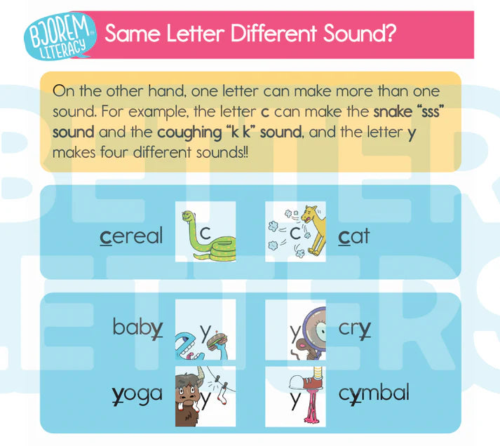 English can be tricky: Bjorem Better Letters™ teaches letters and sounds together to help teach early reading skills. Speech-language pathologists all over the world have been using the images in the Bjorem Speech® Sound Cues to teach sounds to kids with HUGE success. We are excited to offer Bjorem Better Letters™ to help teachers and parents teach letters and their sounds.