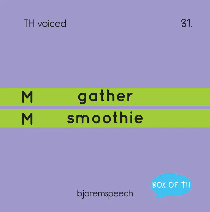 The Box of TH sounds contains 40 cards with 25 initial voiceless /th/ targets, 13 medial voiceless /th/ targets, 16 final voiceless /th/ targets, 5 initial voiced /th/ targets, 13 medial voiced /th/ targets, 2 final voiced /th/ targets, 74 total targets.