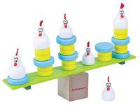 Experience hilarious barnyard antics with ChickyBoom! This all-wooden balancing game challenges players to carefully remove chickens, wagon wheels, and hay bales from a wobbling perch. It's a game of balance, counting, and laughs that'll have you saying 'Chickyboom!' Winner with the highest score takes all! A fun game that plays like a toy.