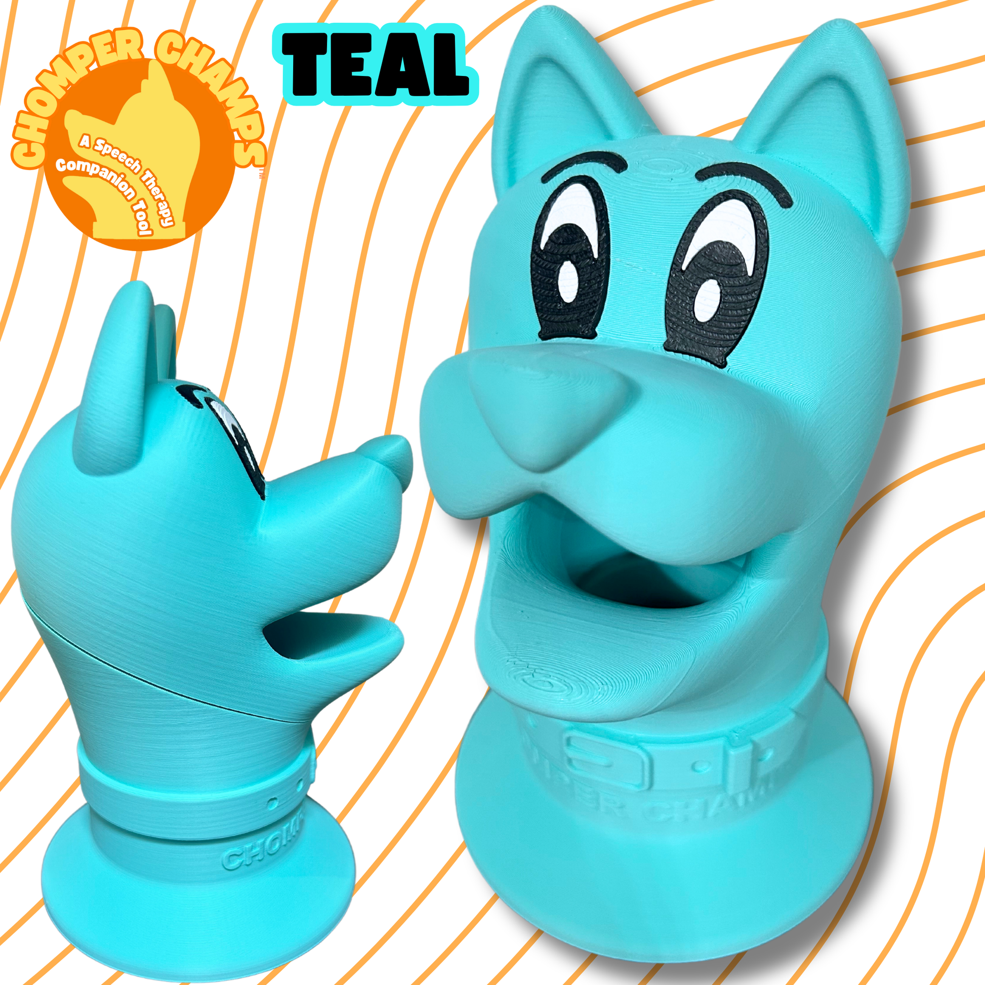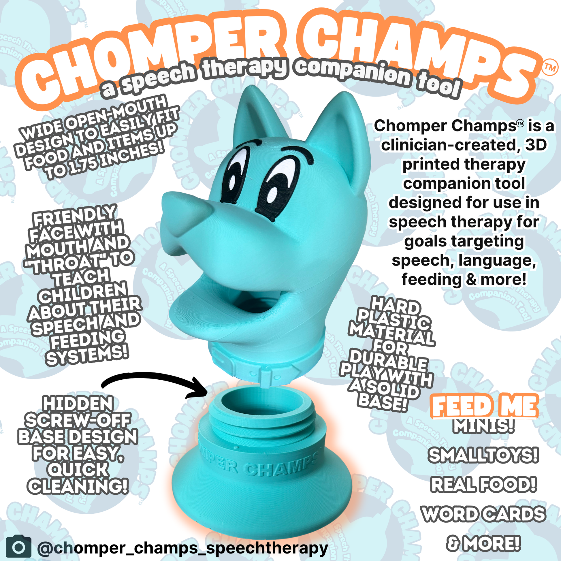 Chomper Champs is a 3D printed product designed by an SLP! Skipper the dog Chomper Champs features a welcoming puppy face with an open mouth and easy-to-clean removable base designed to easily feed items targeting speech, language, and feeding goals!