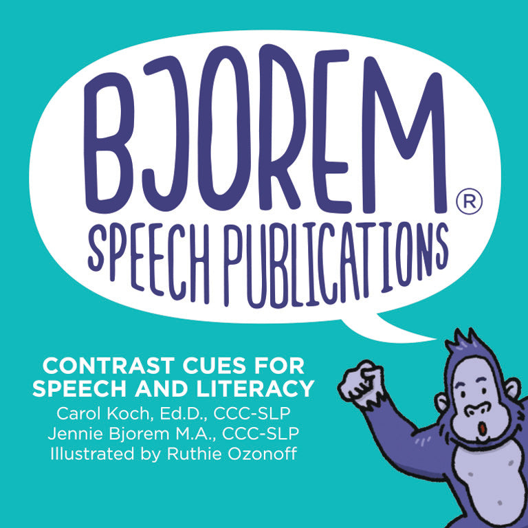 Bjorem Speech Sound Cues for the Contrast Approaches and Literacy feature the tools and stimuli for all three minimal pairs approaches: minimal, multiple, and maximal oppositions. The set incorporates cues for teaching new sounds in the initial word position but also how different initial speech sounds create new and different words. This emphasizes both the motor aspect of speech sound production, but also the linguistic aspect of how sounds create different words. To accomplish this, this pack of cues contains initial consonant targets and the “rimes” which are the V and VC cues that, when added to the initial targets, create words. There are 22 onset (beginning sounds) and 58 rimes that can create at least 700 true words. The words are used to contrast two or more phonemes featured in minimal pair words/sets.