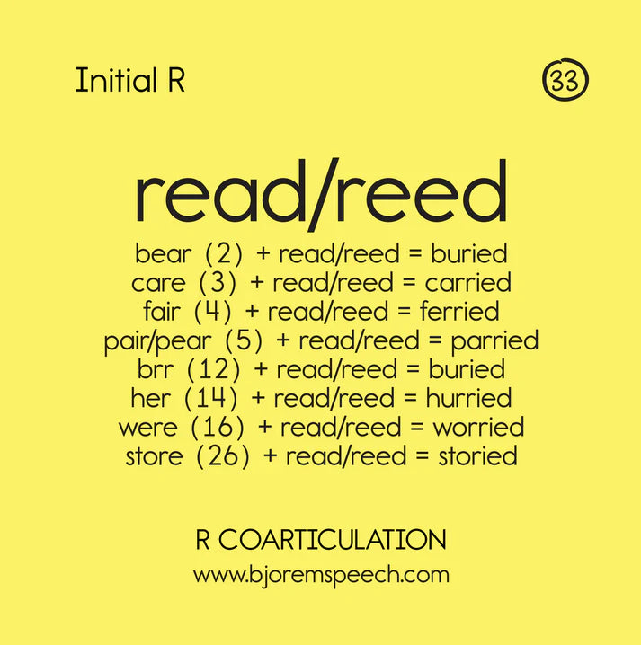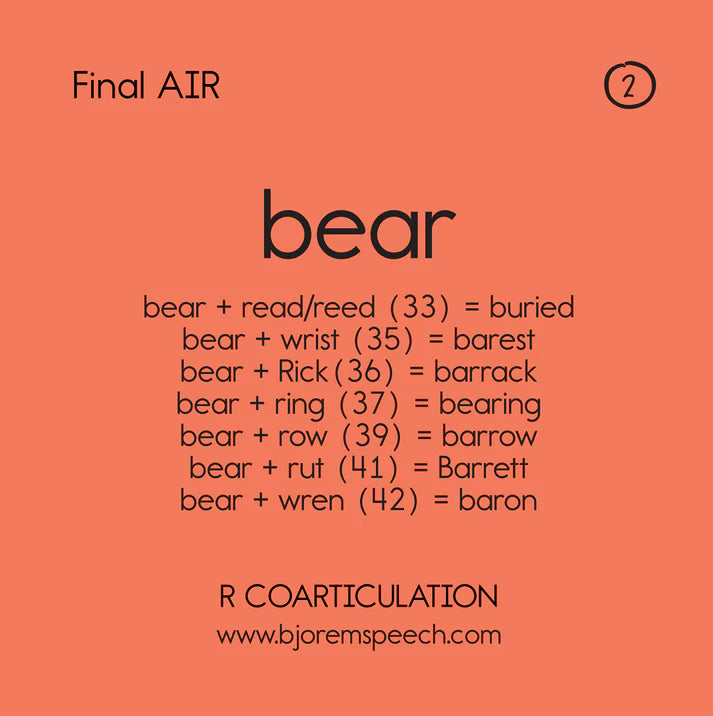 /ɹ/ Coarticulation (by Lindsey Hockel of Speechy Things-R Sound Specialist): This deck contains 7 types of cards: Initial R, Final ar, Final ear, Final ire, Final air, Final er, and Final or. By combining Final R cards with Initial R cards you can create new Medial R words to support the use of coarticulation strategies during your speech therapy sessions.