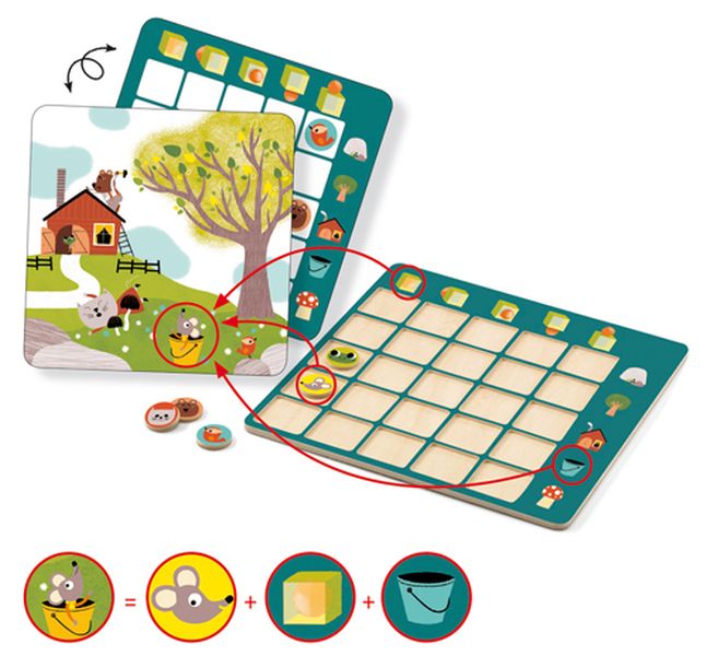Give the position of the five animals with respect to the five elements in the scene. This is a fun and easy game that teaches kids about spatial relationships.
