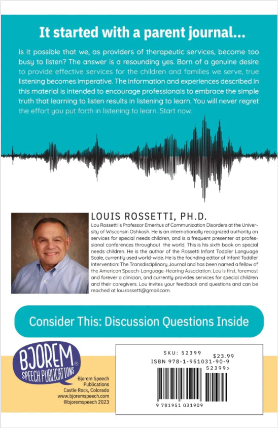 It started with a parent journal… Is it possible that we, as providers of therapeutic services, become too busy to listen? The answer is a resounding yes. Born of a genuine desire to provide effective services for the children and families we serve, true listening becomes imperative. The information and experiences described in this material is intended to encourage professionals to embrace the simple truth that learning to listen results in listening to learn. You will never regret the effort you put forth in listening to learn. Start now.