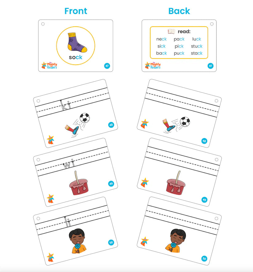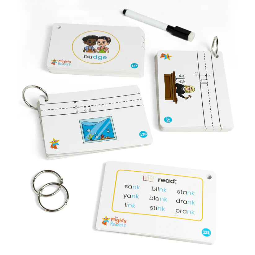 Each package contains 178 wipeable cards, 4 rings, and 1 dry-erase marker. Within the 178 wipeable cards there are: 20 introduction cards, 154 practice cards, and4 instruction cards for adults.