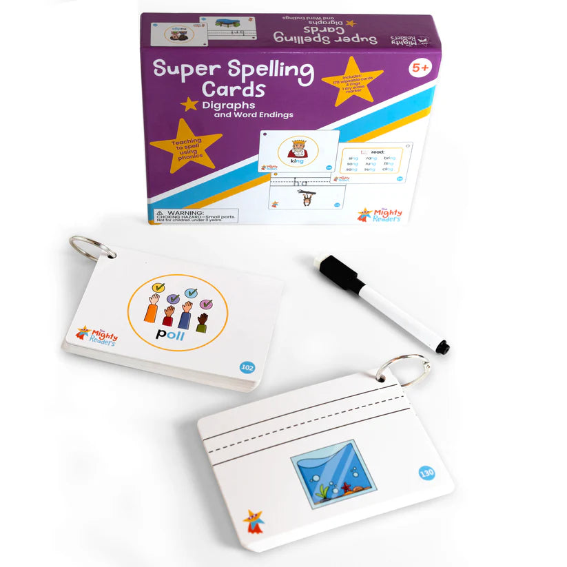 Is your child moving beyond knowing the basics of the 26 letters of the alphabet? Cultivate strong knowledge of the more advanced spelling patterns with the Super Spelling Cards: Digraphs and Word Endings set.