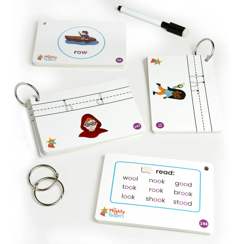 Each package includes 189 wipeable cards, 4 metal rings, and 1 dry-erase marker. The 189 cards include 24 introduction cards, 160 practice cards, and 5 instruction cards for grown ups.