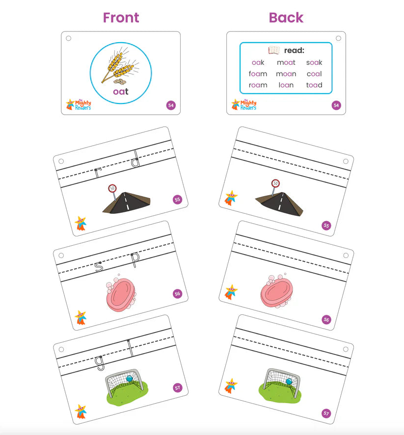 - Long vowels (ai, ay, ee, ea, ey, oa, ow, oe, ie, igh, oo, ew, ui, ue)