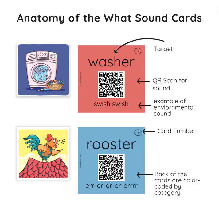 Children are born ready to explore the fascinating world of sounds, and "What Sound?" is the perfect guide for their auditory adventure! This innovative Bjorem Speech® product is designed with vibrant pictures on the front and, on the back, the word along with a QR code. When scanned, the QR code plays the corresponding animal or environmental sound, making learning interactive and fun!